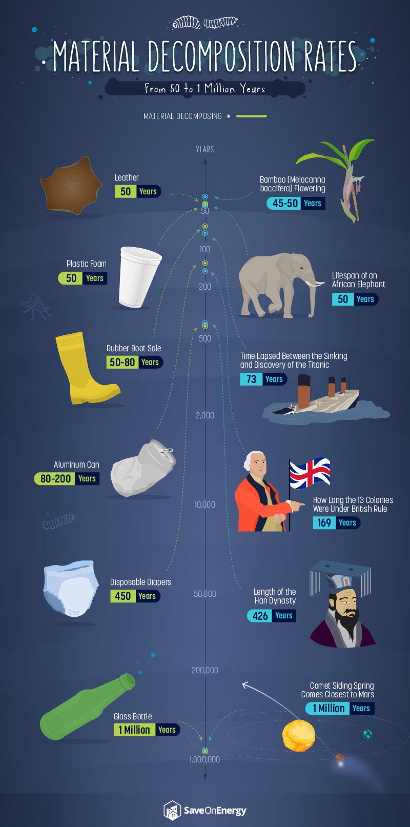 SaveOnEnergy, una empresa que ayuda a la gente a elegir a su proveedor de electricidad, recientemente presentó unas gráficas que ilustran el problema de la basura que dura mucho tiempo. El grupo utilizó datos de fuentes como la NOAA y dependencias del gobierno de EU para encontrar las tasas de descomposición de los materiales cotidianos, y los resultados en realidad te harán pensar: