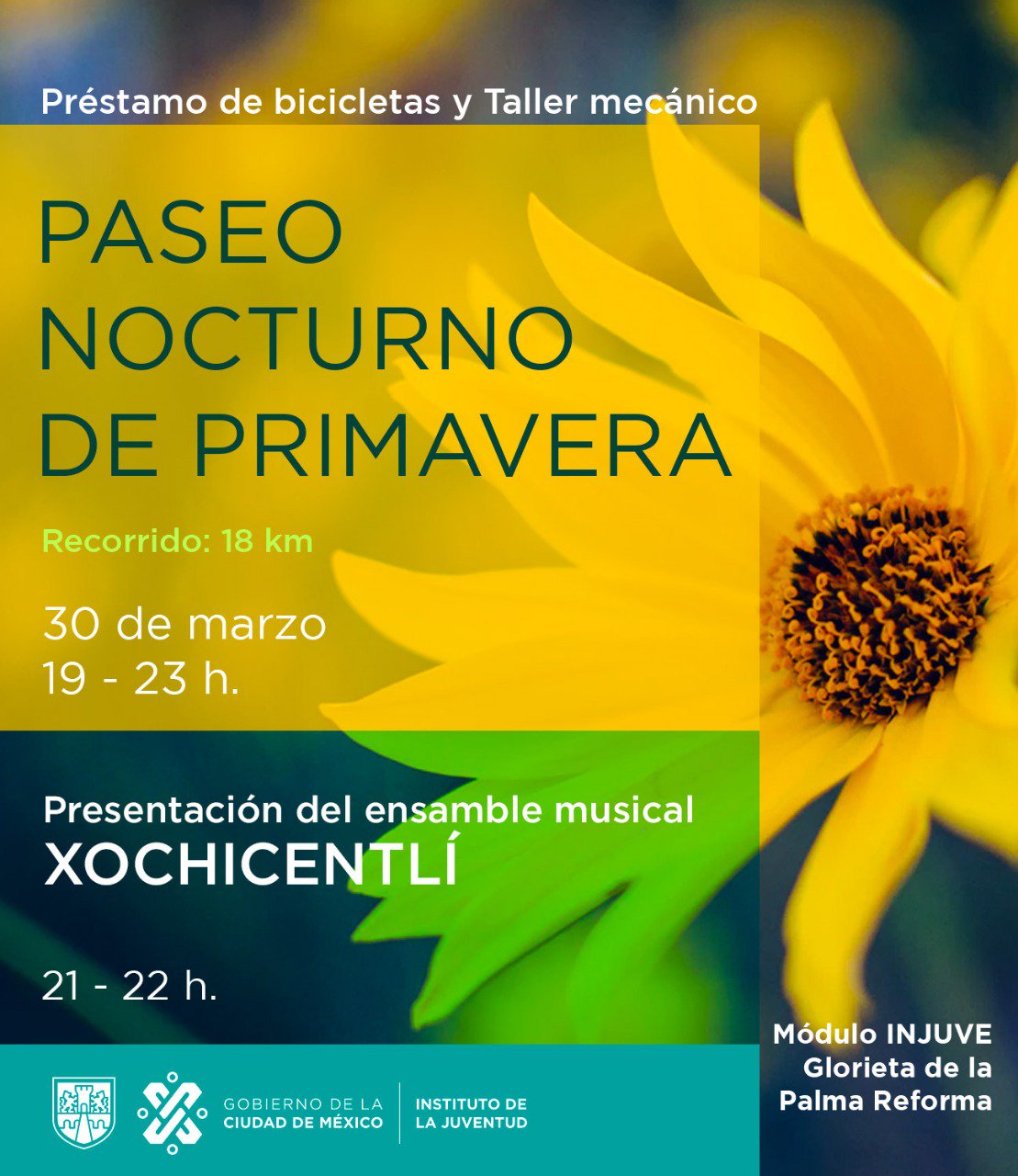 El Instituto Mexicano de la Juventud (@ImjuveMX) invitan al Paseo Nocturo de Primavera, este 30 de marzo, que será de las 19 a las 23 horas en la Ciudad de México.